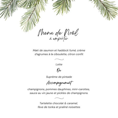 Découvrez notre menu de Noël 2025 et créez un repas festif à votre image. Entrée, plats, desserts : choisissez ce qui ravira vos papilles et celles de vos convives. Offrez-vous un Noël savoureux et unique, prêt à emporter et à déguster !